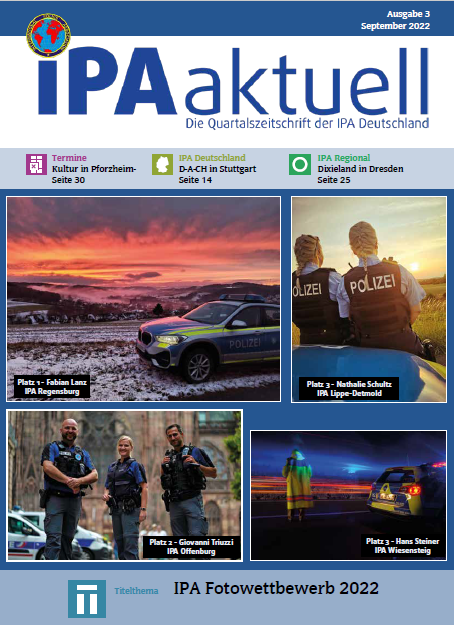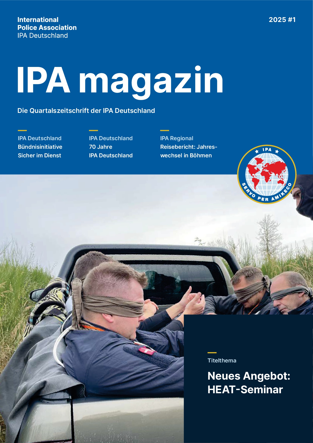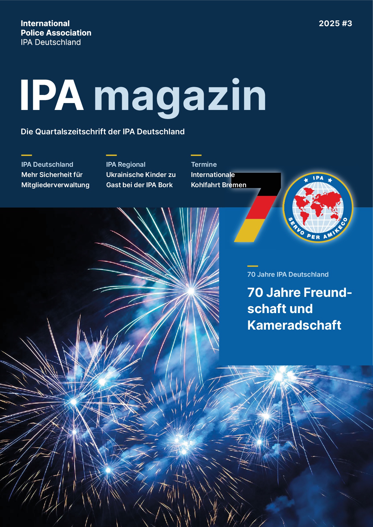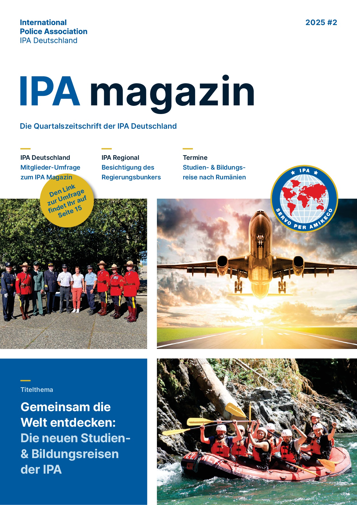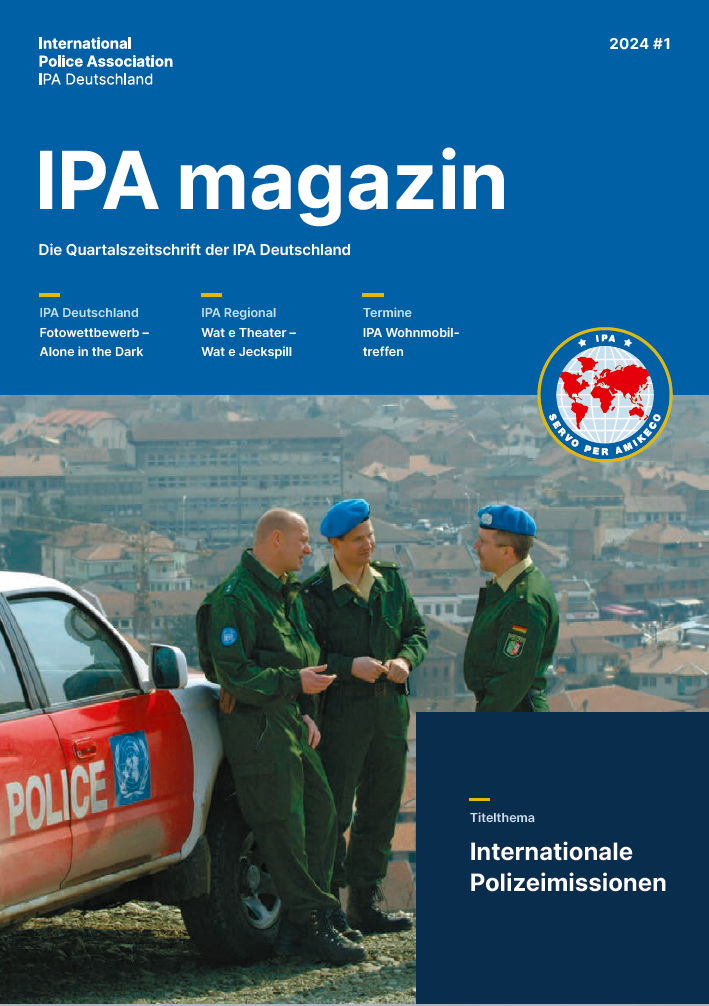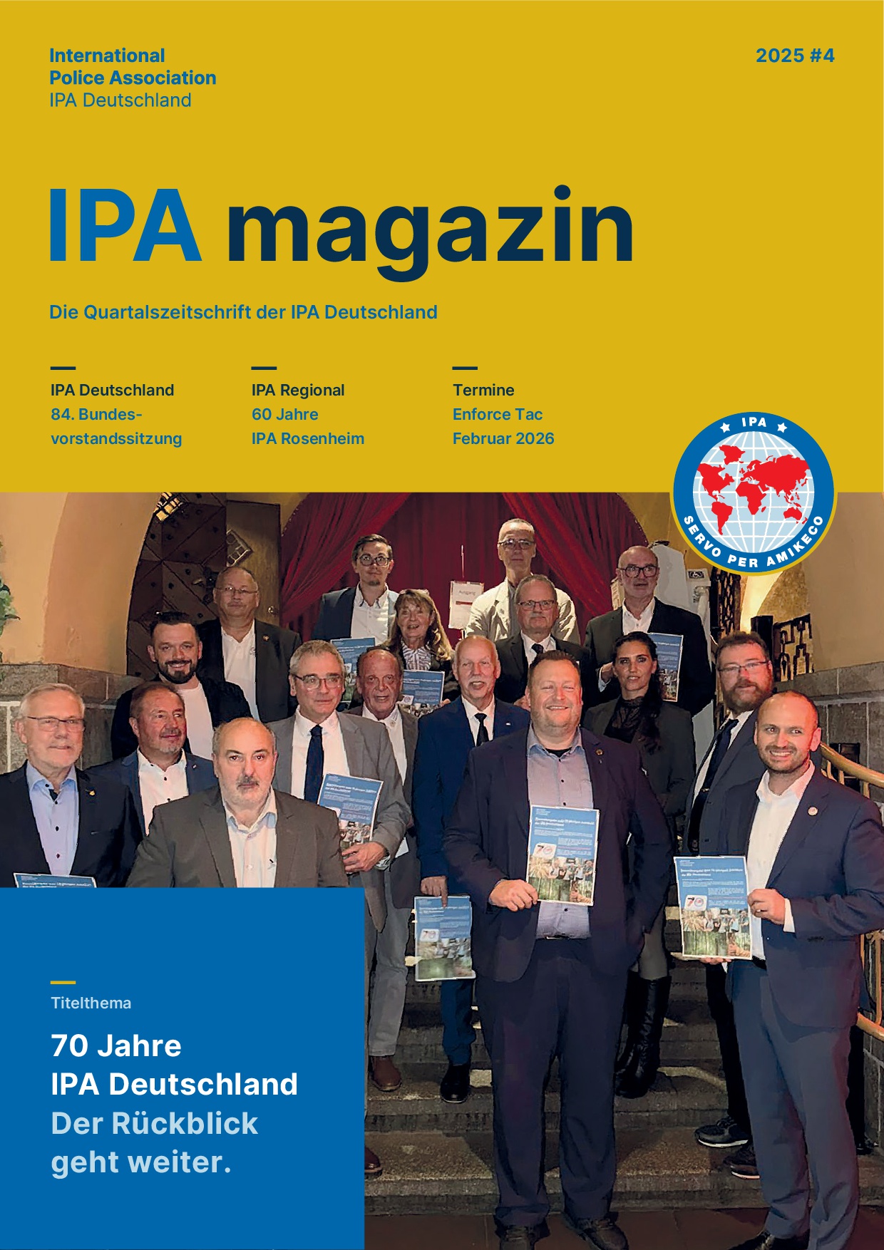 Das IPA magazin ist die Quartalszeitschrift der lnternational Police Association (IPA) Deutsche Sektion e.V.. Es ist die auflagenstärkste unabhängige deutsche Polizeipublikation und spricht die Angehörigen sämtlicher Polizeien bundesweit an. Das IPA magazin ist die bedeutendste Polizei-Publikation mit internationaler Leserschaft. Es wird an alle Mitglieder der IPA Deutschland, sowie an 65 verschiedene IPA Sektionen, sowie an alle Dienststellenleiter der höheren und mittleren Führungsebenen der Innenministerien und Polizeibehörden in Deutschland versandt.