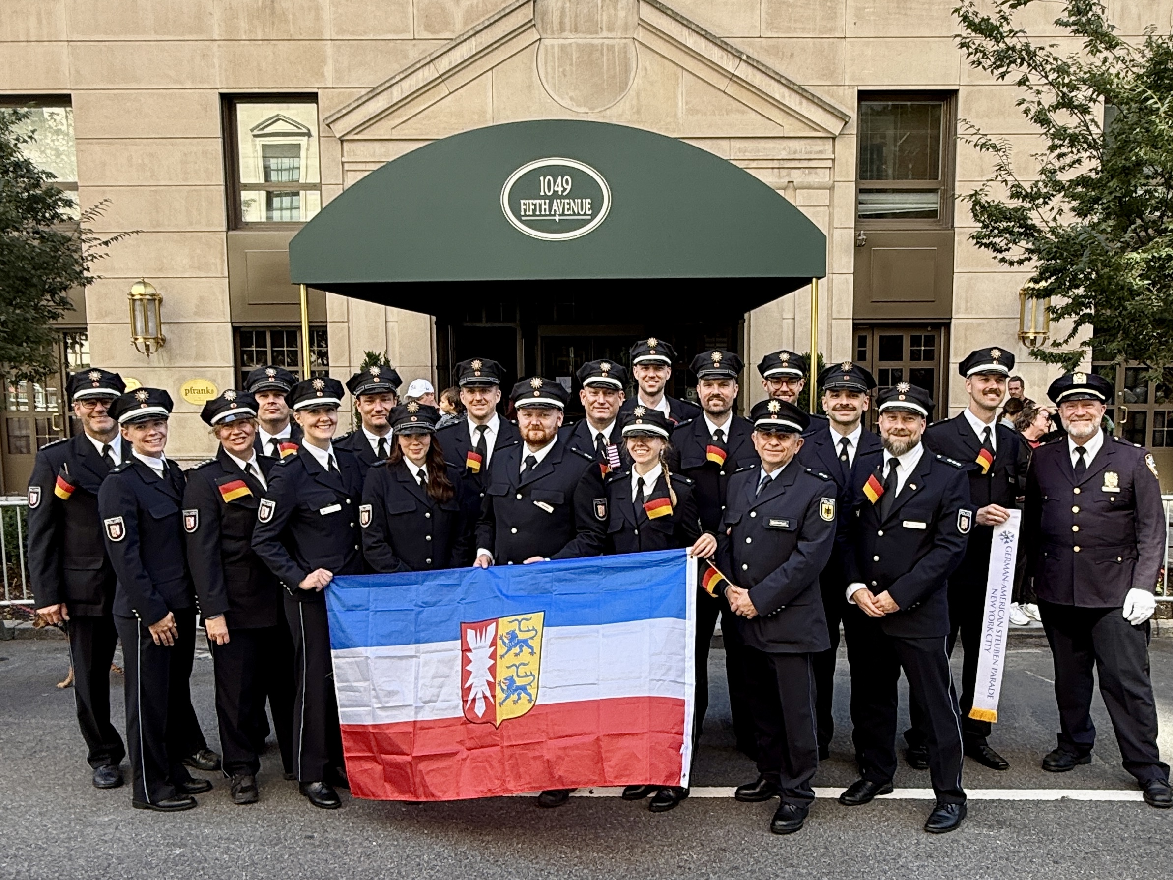 Danach stellten wir uns zwischen Trachtenvereinen, Feuerwehren und Spielmannszügen in Formation auf und warteten auf den Start der Parade. Die Zeit wurde zum Tauschen von Patches und Coins genutzt. Als die Parade begann, marschierten wir in der ersten Divison hinter der „Honor Guard“ des NYPD die 5th Avenue entlang – begleitet von tausenden begeisterten Zuschauern. Wir wurden bejubelt, erhielten Fähnchen und viele Dankesbekundungen für unsere Arbeit. Selbst Kollegen aus Flensburg entdeckten wir im Publikum. Unvergessliche Momente für uns alle.
