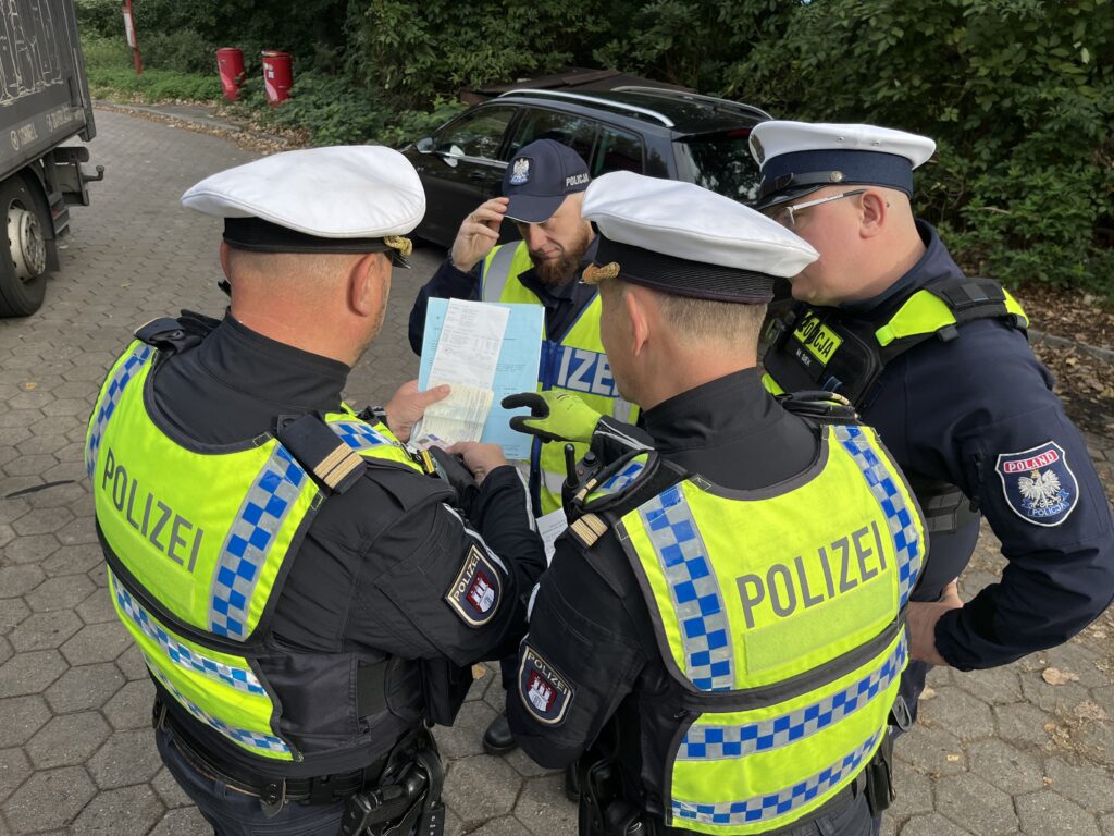 Am Freitag ging es schon früh zur Wasserschutzpolizei nach Harburg. Unser IPA-Freund Björn-Michael Schüning vom Stab der WS hatte mir nach Absprache mit WSPL Andre Bertram einen Besichtigungstermin bei WSP 513/Gefahrgutkontrolle ermöglicht. Dort erwarteten uns Robert Duszynski und Enrico Schierenberg-Nyhuß. Robert, der selbst in Polen geboren ist, gab uns zunächst auf polnisch einen Überblick über die Organisation der WS allgemein und der WSP 513 im besonderen. Anschließend ging es mit ihrem Dienstfahrzeug zu einer Gefahrgutkontrolle auf die Hohe Schaar. Dort wurden mehrere Fahrzeuge kontrolliert, welche Gasflaschen oder Benzin geladen hatten und unseren Hospitanten wurde erläutert, was alles bei solch einer sogenannten ADR-Kontrolle zu beachten ist und wie die anschließende Berichtsfertigung aussieht.