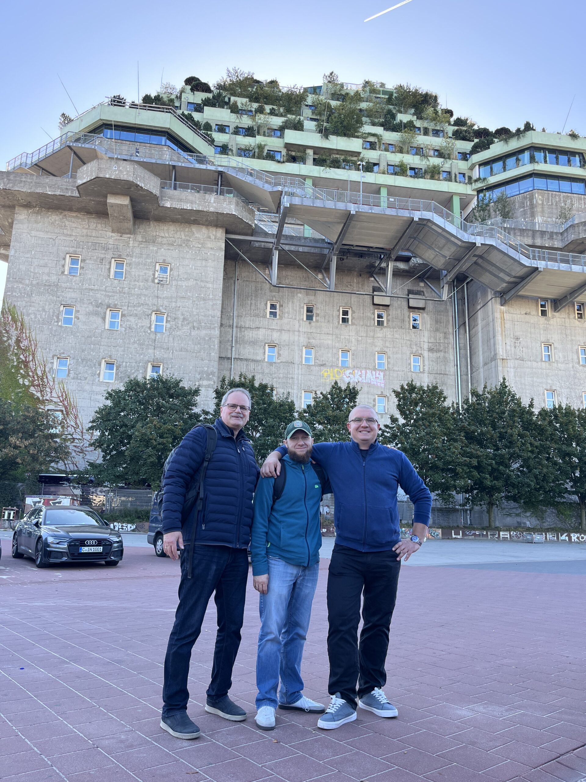 Wir fuhren mit der U-Bahn entlang des Hafens zur Feldstraße. Hier erklommen wir die Außentreppe auf den neu gestalteten begrünten Hochbunker und genossen bei strahlendem Wetter von oben den Rundumblick auf ganz Hamburg.