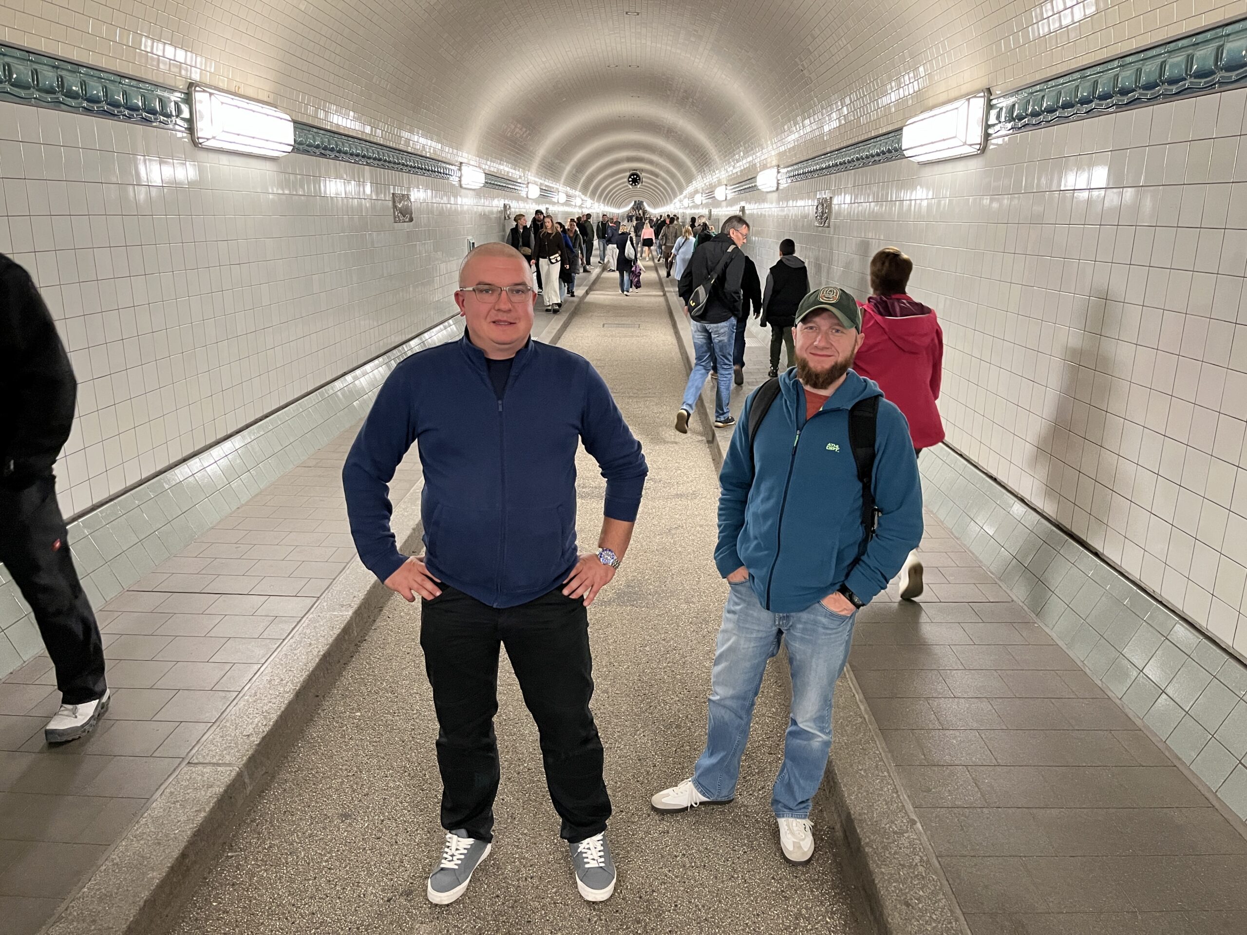 Dann fuhren wir mit der Linie 62 über die Elbe nach Finkenwerder und ich konnte ihnen dabei einiges über Hamburg und seinen Hafen erzählen. Zurück an den Landungsbrücken wurde im Blockbräu zu Mittag gegessen. Frisch gestärkt ging es hinunter in den Alten Elbtunnel, bevor die Kollegen noch ein paar Souvenirs für die Familie einkauften.