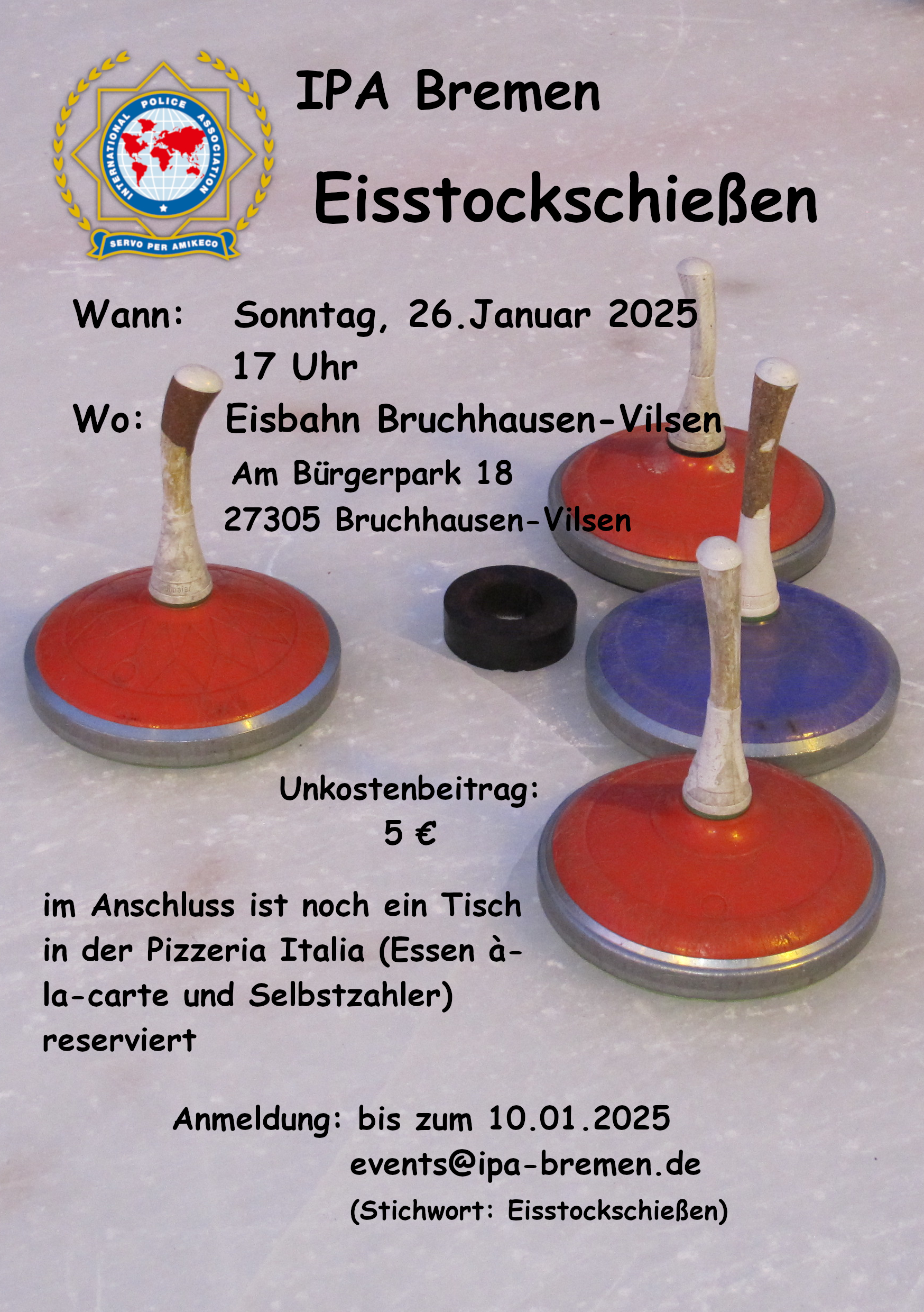 Am 26.01.2025, ab 17:00 Uhr richtet die VbSt. Bremen wieder das beliebte Eisstockschießen auf der Eisbahn in Bruchhausen-Vilsen aus. Alle Infos zur Anmeldung können dem anliegenden Flyer entnommen werden!