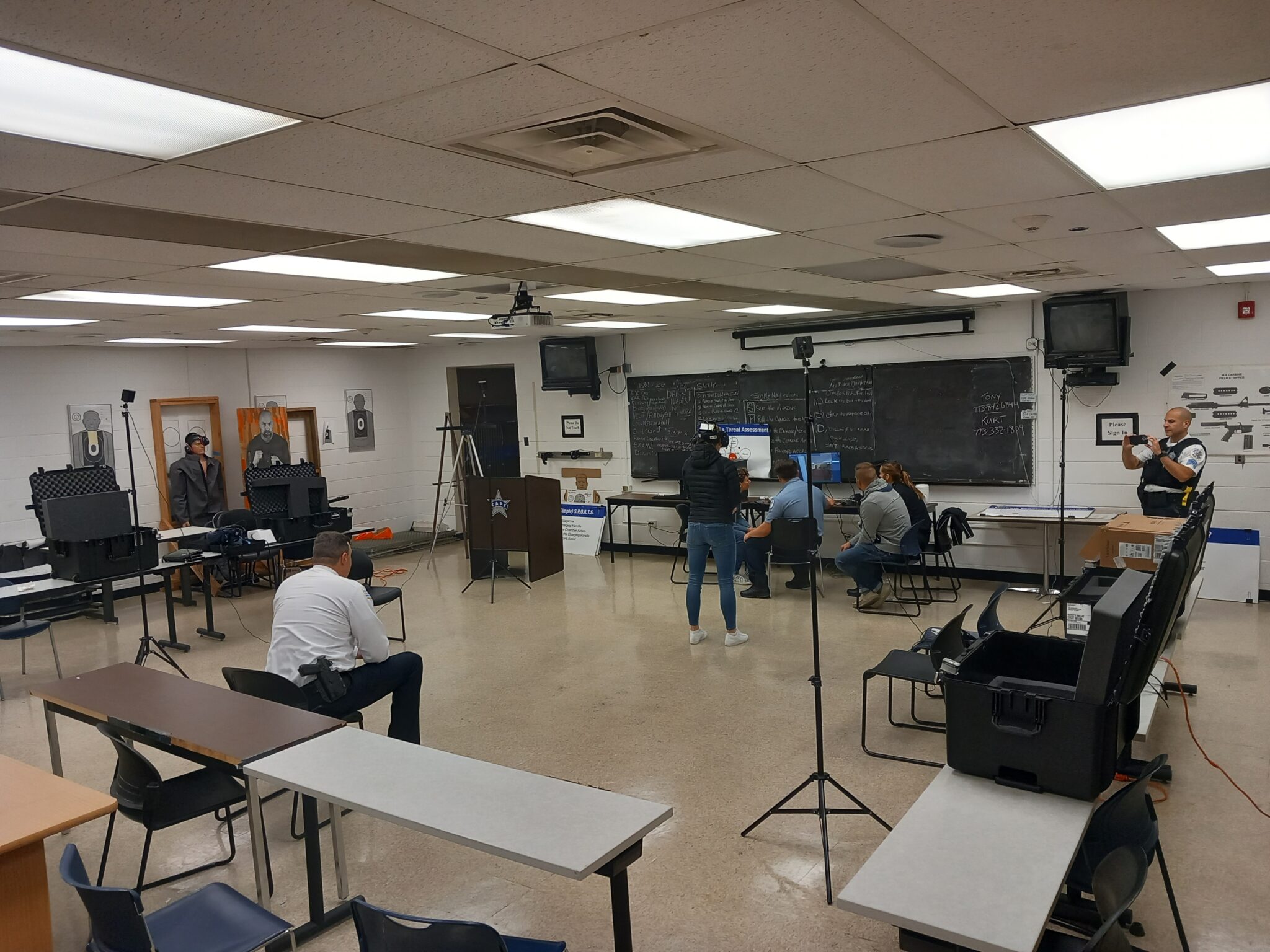 Im Anschluss fuhren wir zum PSTC, dem Public Service Training Center, einem brandneuen Gebäudekomplex aus Beton, den Ausmaßen eines Baumarktes und natürlich mit Großparkplatz. Für 130 Mio. USD wurde mit dem PSTC eine Fortbildungsstätte geschaffen, die von der Polizei Chicago (CPD), den umliegenden Polizeien und der Feuerwehr von Chicago (CFD) genutzt wird. Wir erhielten nach Empfang der Besucherausweise und blauer Besucherwesten sowie einem Sicherheitscheck wie am Flughafen Zugang und eine ausgiebige Führung durch den Komplex, in dem wir auch fotografieren und filmen durften.