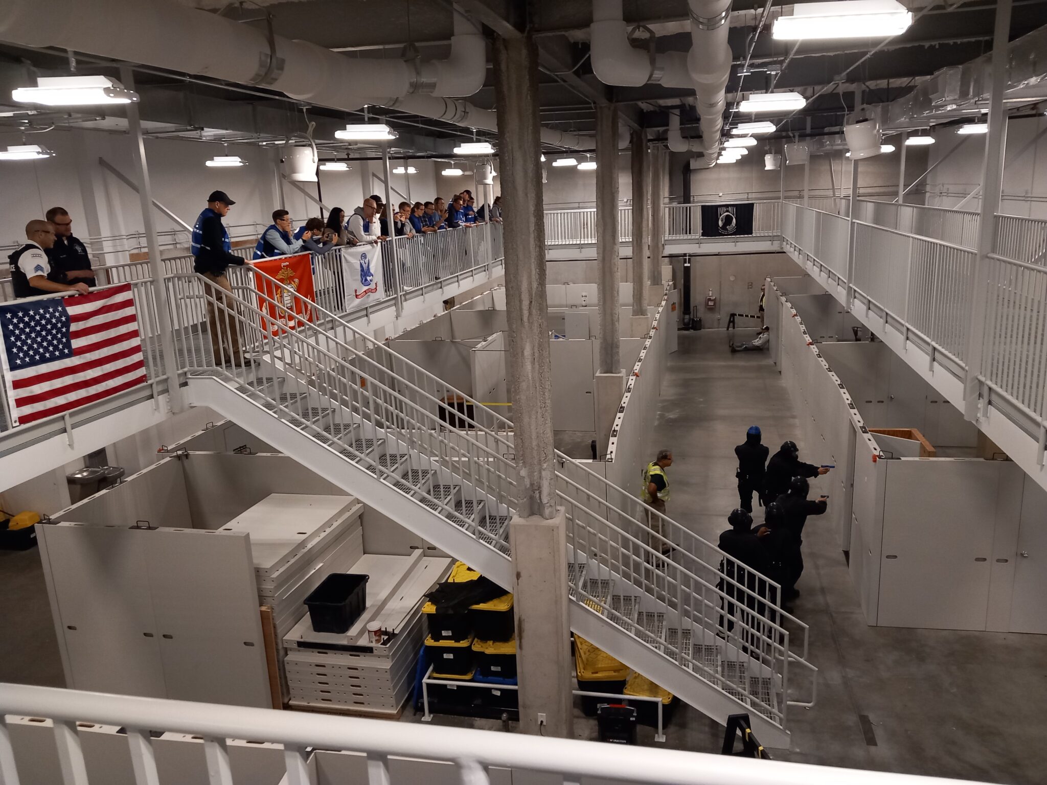 Im Untergeschoss befand sich in einem Schulungsraum eine 3D-Schießanlage im Wert von 50000 US-Dollar: hierbei stehen vier Stative, ca. 2,20 m hoch, mit dort angebrachten Sensoren, als ca. 5 x 5 m großes Quadrat und die trainierende Person in diesem Quadrat trägt einen 3D-Helm sowie eine Pistole mit Sensoren. Ein Trainer und die Zuschauer verfolgen auf einem PC-Monitor das Szenario – auch hier durfte eine Kollegin eine Lage bewältigen, zudem vollständig auf Englisch. Hin und wieder musste sie am Rücken angestupst werden, weil sie das Quadrat rückwärts verlassen wollte.