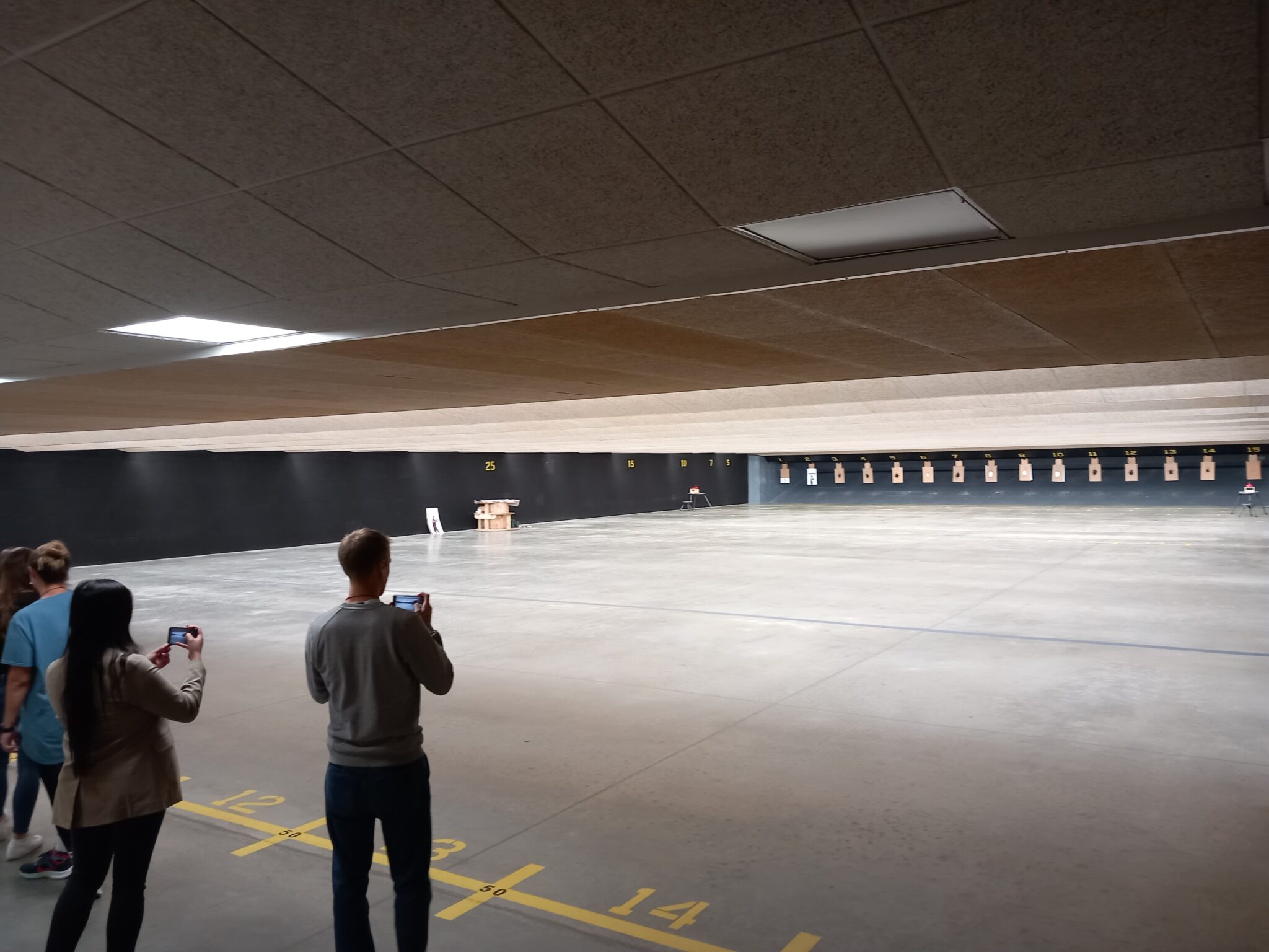 Danach wurden wir durch die Sporträume geführt, in denen allgemein bekannte Trainingsgeräte standen. Ein weiteres Highlight war ein Schießraum, der aus fünf bienenwabenähnlichen Leinwänden bestand, die vom Boden bis zur Decke reichten. Auf diesen Leinwänden werden interaktive Szenarien abgespielt, von denen hunderte zur Verfügung stehen und bei denen mit Laserwaffen auf die Ziele geschossen werden kann. Zwei Kolleginnen aus Hamburg bekamen ein Amoklaufszenario in einem Kino-Komplex zur Aufgabe gestellt und bewältigtes es sehr gut. Dieses System hier ist übrigens seit 2015 in Betrieb.