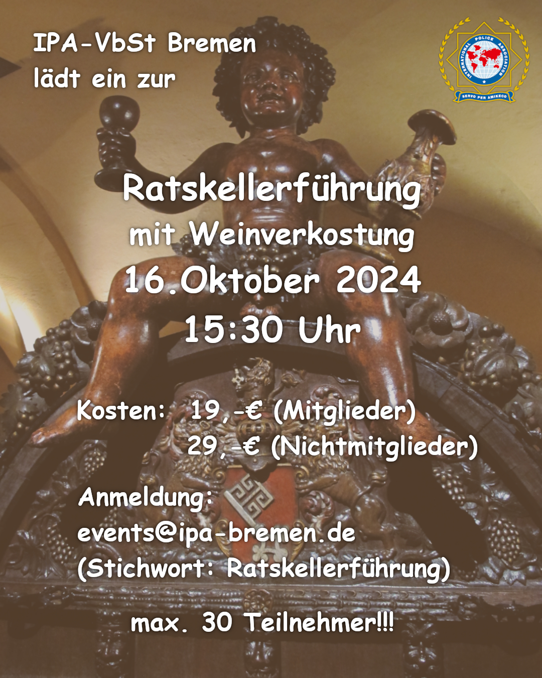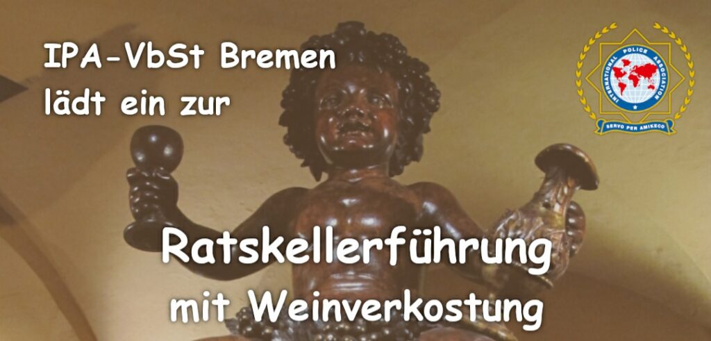 Für den 16.10.2024 hat die IPA VbSt. Bremen eine ganz besondere Ratskellerführung mit Weinverkostung organisiert! Alle Infos sind dem anliegenden Flyer zu entnehmen! Jetzt schnell anmelden, die Plätze sind begrenzt!