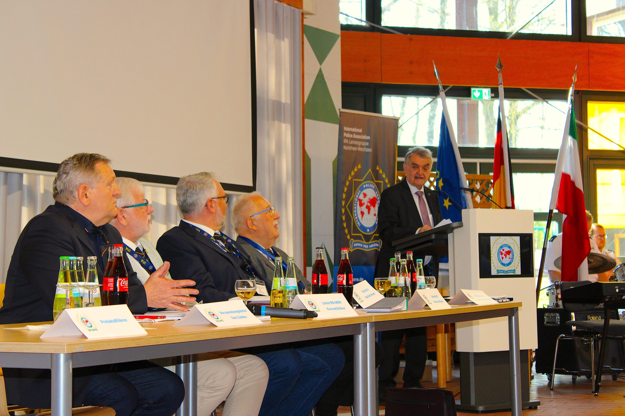 Bereits am Freitag, den 04.04.25, trafen die ersten Gäste des Landesdelegiertentages auf dem LAFP NRW-Gelände in Selm-Bork ein: Am selben Wochenende war das 70jährige Jubiläum der Landesgruppe IPA NRW geplant, sodass die Delegierten sowie ihre Begleitungen bereits am Freitagabend neue und alte Kontakte zu den Teilnehmenden der weiteren Verbindungsstellen knüpfen und vertiefen konnten. Nach Kaffee und Kuchen lauschten die Gäste beeindruckt dem Landespolizeiorchester (LPO), welches besonders mit der bekannten Musik des gleichnamigen Films „Fluch der Karibik“ glänzte. Am Samstagmorgen begann schließlich die Versammlung aller 139 anwesenden Delegierten in der Mensa des LAFPs NRW: Neben einigen internationalen Ehrengästen erschienen auch der Innenminister Herbert Reul als Schirmherr, der Präsident der IPA Deutschland, Philipp Kurz, der Landrat des Kreises Unna und damit der Repräsentant des Kreises Unna, Mario Löhr und der Bürgermeister der Stadt Selm, Thomas Orlowski, deren Reden die Anwesenden mit Freude lauschten. Von LAFP NRW war außerdem der Vertreter der LAFP-Führung, der leitende Polizeidirektor Herr Udo Tönjan, vor Ort. Die Wahl des neuen Vorstandes, welcher bis auf zwei Positionen mit der vorherigen Besetzung übereinstimmte, bestätigte die Zufriedenheit der Delegierten mit der hervorragenden Vorstandsarbeit in den vergangenen Jahren. Während diese und weitere verschiedenen Abstimmungen und Wahlen durchgeführt wurden, hatten die Begleitpersonen die Möglichkeit der Besichtigung im Schloss Nordkirchen bei strahlendem Sonnenschein. Der Landesdelegiertentag endete mit der geplanten Jubiläumsveranstaltung in der Mensa: Weitläufige Buffet-Arrangements luden die Gäste zu einem Gaumenschmaus ein, der die gemeinsamen Gespräche unter den Mitgliedern verschiedenster Verbindungsstellen hervorragend ergänzte. Am Folgetag hieß es für die Gäste schließlich nach einem ausgiebigen Brunch: Abschied nehmen! Aber nicht für immer, denn wie viele Teilnehmer*innen des Wochenendes bei der IPA-Verbindungsstelle Bork e.V. im Anschluss mitteilten, konnten sie untereinander neue Freundschaften knüpfen, die auf ein baldiges Wiedersehen schließen ließen. Ein besonderer Dank wurde mehrfach dem Helferteam ausgesprochen, durch welches sich die Gäste bestens umsorgt und begleitet fühlten und durch die sowohl die organisatorische als auch technische Umsetzung des Landesdelegiertentages sowie der Jubiläumsfeier erst möglich wurde.