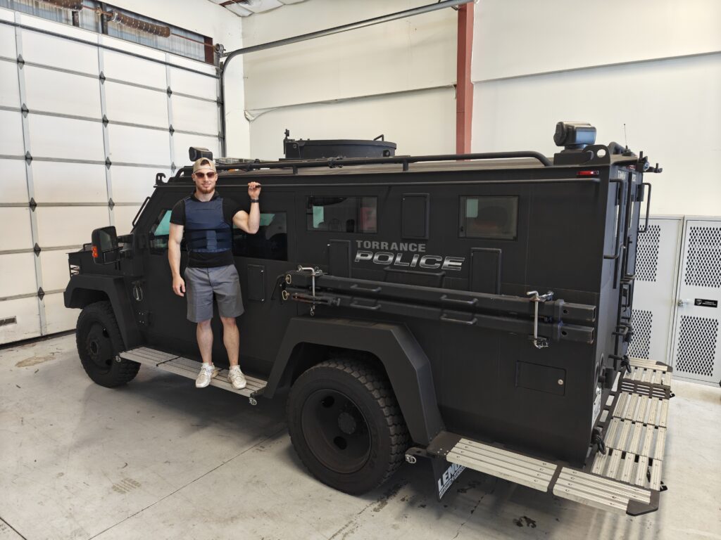 Ich stand um 4 Uhr morgens auf, denn es ging um 5:45 Uhr zur Einsatzbesprechung beim Torrance Police Department (TPD). Der Ride-Along beim TPD wurde von John von der International Police Association (IPA – US-Region 6) organisiert. John diente über 30 Jahre beim TPD und schrieb sogar ein Buch über die Dienststelle. Mein Streifenpartner war Officer Darryl. Er zeigte mir das gesamte Department: Schießstand, Fitnessstudio, Einsatzzentrale, SWAT-Fahrzeug (Lenco BearCat) und Gewahrsam. Ich durfte auf dem Schießstand sogar an einem kurzen Schießtraining teilnehmen. Außerdem erhielt Einblicke in die Funktionsweise nicht-letaler Waffen wie den Taser 7 und die sog. „Sponge Gun“. Während des Dienstes kam es unter anderem zu einer Verfolgungsjagd, an welcher verschiedenste Organisationseinheiten beteiligt waren (Helikopter, K-9-Einheit, SWAT, Drohnen und Zivilermittler). Beeindruckend: Das SWAT-Team war dank einem sog. ,,Part-Time‘‘ Modell innerhalb weniger Minuten vor Ort – trotz Personalknappheit. Nach Schichtende holte mich John von der Polizeidienststelle ab und führte mich im Anschluss noch durch die Hauptwache des Torrance Fire Department (TFD), wo ich den Fire Chief und einen SWAT-Paramedic vom TFD TEMS-Team (Tactical Emergency Medical Service) traf. Den Tag beendeten wir mit leckerem hawaiianischem Essen.