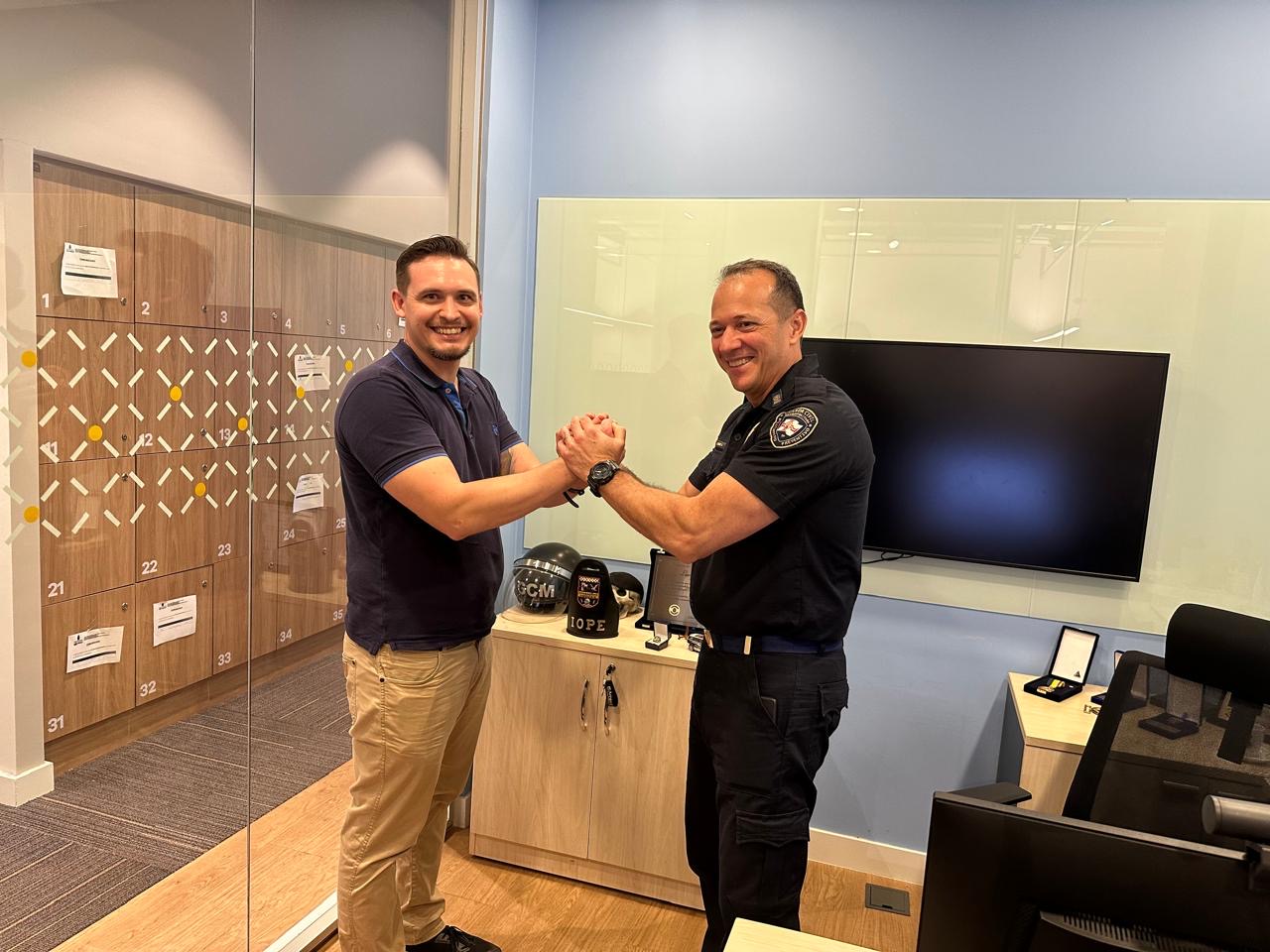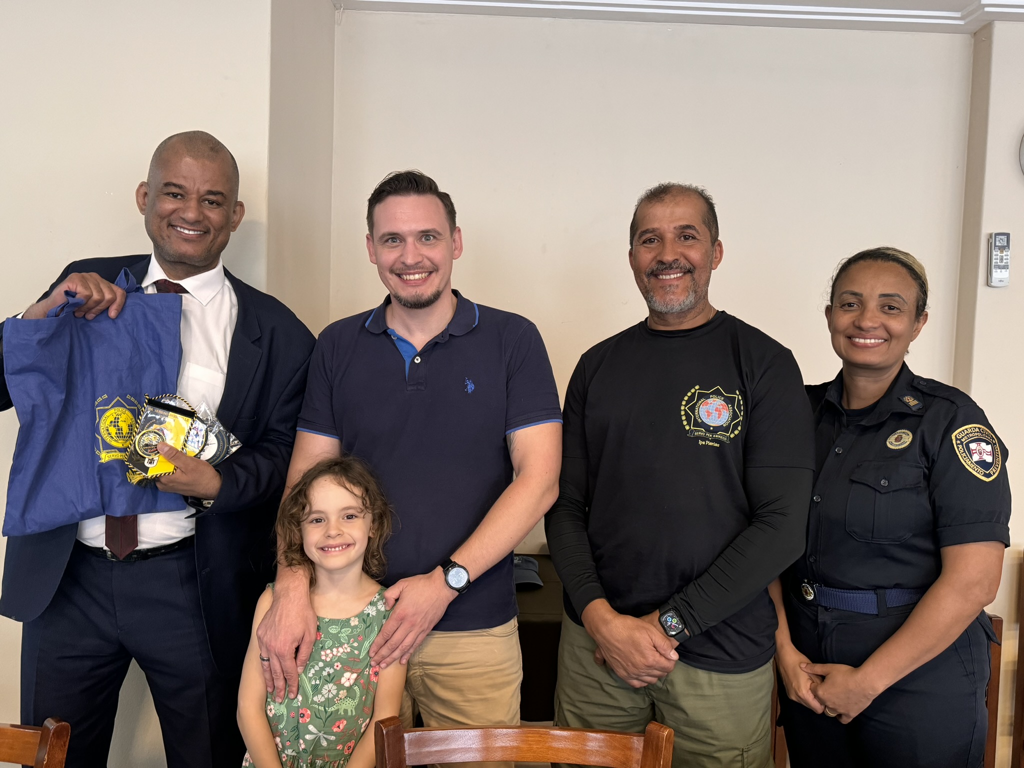 Natürlich gehörte zum Abschluss des Besuchs auch der Austausch von Geschenken und Patches mit den brasilianischen Kollegen. Dann wurde es noch einmal besonders: Ich hatte die große Ehre, den Polizeipräsidenten der GCM, Commandante Geral Agapito Marques, kennenzulernen.